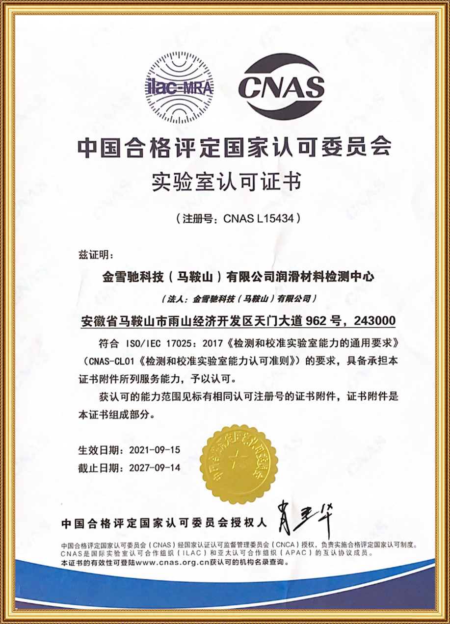 2021年金雪馳科技(馬鞍山)有限公司潤滑材料檢測中心獲得國家認可CNAS實驗室資質證書。